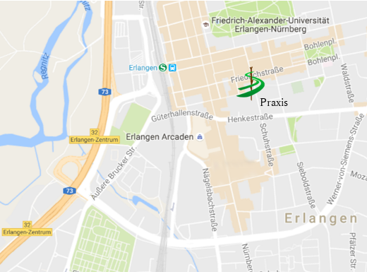 A73, Ausfahrt Erlangen Zentrum, zweite Ampel links ist schon die Schuhstraße. Die Praxis liegt gegenüber dem Institut für Klinische Chemie in Fahrtrichtung links (neben der früheren Bundesbankfiliale).