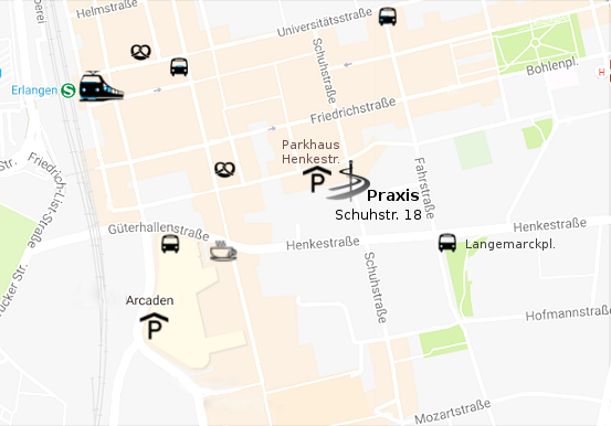 Mit Bus und Bahn ist die Praxis über den Hauptbahnhof Erlangen in 5 Gehminuten zu erreichen. Noch näher sind die Haltestellen Langemarckplatz und Arcaden (3 min).